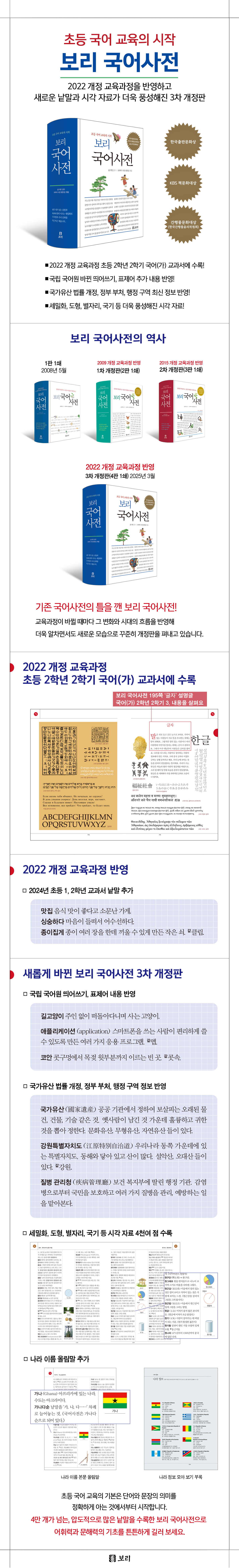 지난 2008년, 『보리 국어사전』이 처음 나왔을 때 이제껏 보아 왔던 사전과는 다른 새로운 모습에 수많은 언론이 주목했습니다. 쉬운 우리말 풀이에 정확하고 아름다운 그림을 곁들여 뜻풀이를 읽지 않고도 한눈에 알아볼 수 있는 ‘어린이 눈높이에 맞춘 사전’으로 평가받아 ‘2008 한국 출판 문화상(한국일보)’, ‘2008 KBS 책 문화대상’, ‘2009 간행물 문화대상(한국간행물윤리위원회)’을 수상하고 ‘2008 한겨레 올해의 책’에 선정되었습니다. 그러나 누구보다 눈이 밝은 건 독자들이었습니다. 내가 보니, 우리 아이가 읽어 보니 참 좋더라는 입소문에 힘입어 꾸준히 1차, 2차 개정판을 낼 수 있었고 2024년까지 모두 50만 부 가까이 팔렸습니다. 그리고 2025년, 지난 17년의 역사를 고스란히 담아 알차면서도 더욱 새로운 모습으로 『보리 국어사전』 3차 개정판이 나왔습니다. 2020년에 2차 개정판이 나온 지 5년 만입니다.