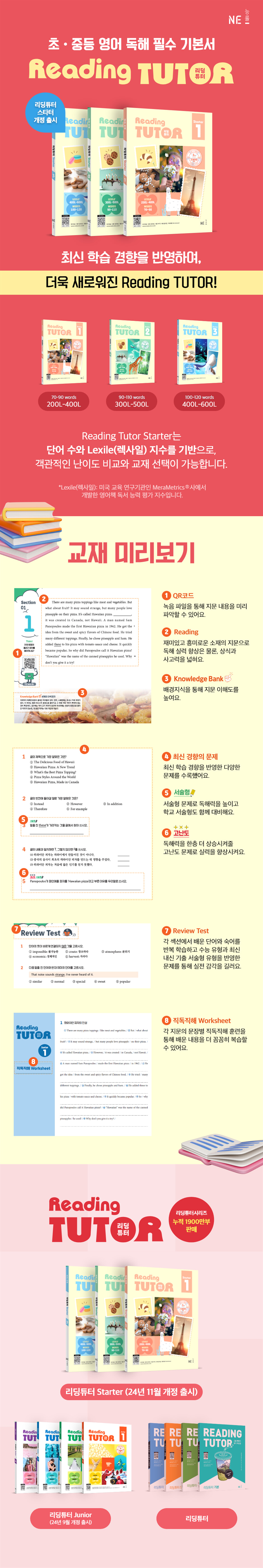 독해의 기본기를 다지는 학생들을 위한 주니어 리딩튜터 스타터가 리딩튜터 스타터로 개정되었다. 리딩튜터 스타터 시리즈는 기존의 2종에서 3종으로 확장되었는데, 독해를 처음 시작하는 학생들의 기본기를 탄탄히 다질 수 있는 교재이다. 다양한 분야의 소재를 재미있게 풀어낸 지문은 물론, 유익한 정보를 쏙쏙 채워주는 배경지식을 제공한다.