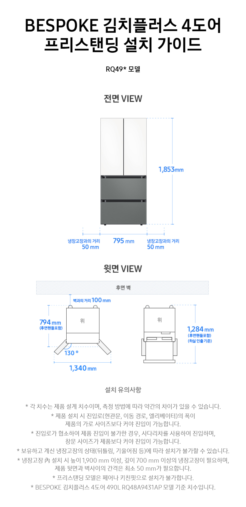 삼성 BESPOKE AI 김치플러스 4도어 490L AI정온모드 에센셜화이트 RQ49DB94H2APEW