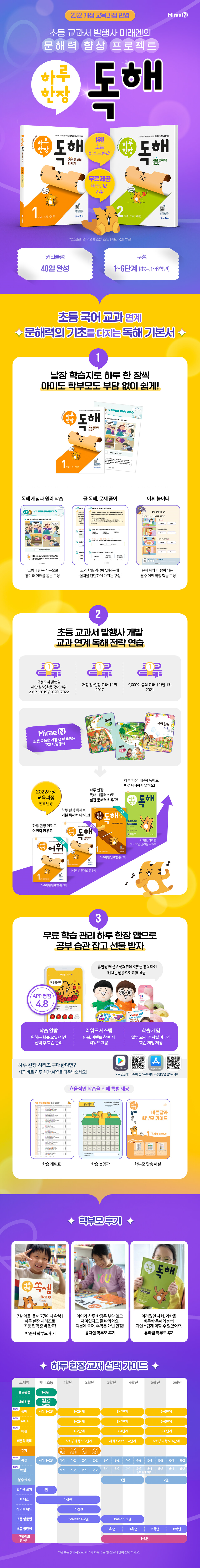 하루 한 장! 낱장으로 구성되어 있어 처음 독해 교재를 접하는 학생(or 자녀)들도 가볍고 부담스럽지 않게 접근할 수 있습니다. 또한 학생들이 재미있어 할 만한 소재의 글과 귀여운 그림으로 줄글 독해의 부담감과 지루함을 완화시키고 학생들이 국어 학습을 하도록 하였습니다. 시키지 않아도 학생 스스로 가볍게 하루에 한 장씩 독해 문제를 푸는 동안 쌓여가는 문해력을 경험해 보실 수 있을 것입니다.