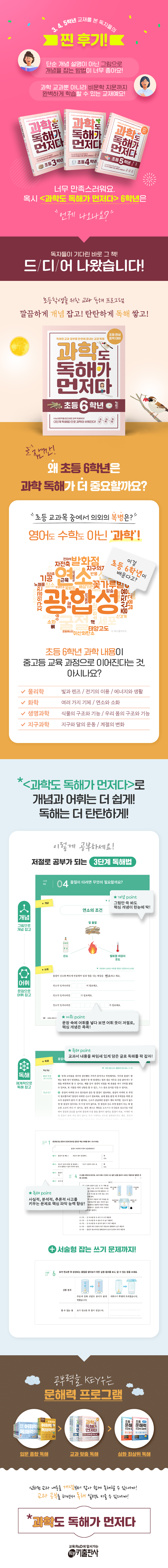 1단원 지구와 우주 01 하루 동안 태양과 달의 위치가 달라지는 까닭은 무엇일까요? 02 계절에 따라 보이는 별자리가 달라지는 까닭은 무엇일까요? 03 여러 날 동안 달의 모양과 위치는 어떻게 달라질까요? 04 하루 동안 태양 고도, 그림자 길이, 기온은 어떤 관계가 있을까요? 05 계절에 따라 태양의 남중 고도, 낮의 길이, 기온은 어떻게 달라질까요? 06 계절의 변화가 생기는 까닭은 무엇일까요? 확인 학습 : 융합 독해 / 개념 정리 2단원 물질 01 산소와 이산화 탄소는 어떤 성질이 있을까요? 02 온도와 압력이 변하면 기체의 부피는 어떻게 달라질까요? 03 공기를 이루는 기체에는 무엇이 있을까요? 04 물질이 타려면 무엇이 필요할까요? 05 불을 끄려면 어떻게 해야 할까요? 06 화재가 발생하면 어떻게 대처해야 할까요? 확인 학습 : 융합 독해 / 개념 정리 3단원 생명 01 생물을 이루는 세포는 어떻게 생겼을까요? 02 뿌리, 줄기, 잎은 어떤 일을 할까요? 03 꽃과 열매는 어떤 일을 할까요? 04 소화 기관과 호흡 기관은 어떤 일을 할까요? 05 순환 기관과 배설 기관은 어떤 일을 할까요? 06 우리 몸에서 자극은 어떻게 전달될까요? 확인 학습 : 융합 독해 / 개념 정리 4단원 운동과 에너지 01 빛은 서로 다른 물질의 경계에서 어떻게 나아갈까요? 02 볼록 렌즈의 특징은 무엇일까요? 03 전구의 연결 방법에 따라 전구의 밝기는 어떻게 달라질까요? 04 전자석이란 무엇일까요? 05 에너지 형태에는 어떤 것이 있을까요? 06 에너지를 효율적으로 이용하는 방법에는 무엇이 있을까요? 확인 학습 : 융합 독해 / 개념 정리 한눈에 보는 개념 총정리 * 정답과 해설 (교재와 분리하여 책 속의 책 형태로 들어 있어요.) 『사회도 독해가 먼저다 초등 6학년』 1단원 우리나라의 정치 발전 01 우리나라의 민주주의는 어떻게 발전했을까요? 02 6월 민주 항쟁 이후 우리나라의 민주주의는 어떻게 발전해 왔을까요? 03 민주주의는 왜 중요할까요? 04 민주적으로 문제를 해결하는 방법은 무엇일까요? 05 민주 정치의 원리는 무엇일까요? 06 국가 기관은 어떤 일을 할까요? 확인 학습 : 융합 독해 / 개념 정리 2단원 우리나라의 경제 발전 01 경제활동에서 가계와 기업은 어떤 역할을 할까요? 02 우리나라 경제의 특징은 무엇일까요? 03 우리나라의 경제는 어떻게 성장했을까요? 04 경제 성장에 따라 우리 사회는 어떻게 변화했을까요? 05 우리나라는 다른 나라와 어떻게 경제 교류를 하고 있을까요? 06 경제 교류로 우리 경제생활은 어떻게 달라졌을까요? 확인 학습 : 융합 독해 / 개념 정리 3단원 세계의 여러 나라들 01 세계는 어떤 모습일까요? 02 세계 여러 나라의 영토 면적과 모양은 어떻게 다를까요? 03 세계 여러 지역의 기후는 어떻게 나타날까요? 04 기후에 따라 생활 모습은 어떻게 다를까요? 05 우리나라는 어떤 나라와 이웃하고 있을까요? 06 우리나라와 관계 깊은 나라는 어디일까요? 확인 학습 : 융합 독해 / 개념 정리 4단원 한반도와 지구촌 01 우리 땅 독도는 어떤 곳일까요? 02 남북통일을 위해 어떤 노력을 하고 있을까요? 03 지구촌에서는 어떤 갈등이 일어날까요? 04 지구촌 평화와 발전을 위해 어떤 노력을 하고 있을까요? 05 지구촌 환경 문제를 어떻게 해결할 수 있을까요? 06 지속 가능한 미래를 위해 어떤 노력을 해야 할까요? 확인 학습 : 융합 독해 / 개념 정리 한눈에 보는 개념 총정리 * 정답과 해설 (교재와 분리하여 책 속의 책 형태로 들어 있어요.) 출판사 리뷰왜 과학도 독해를 공부해야 할까요?