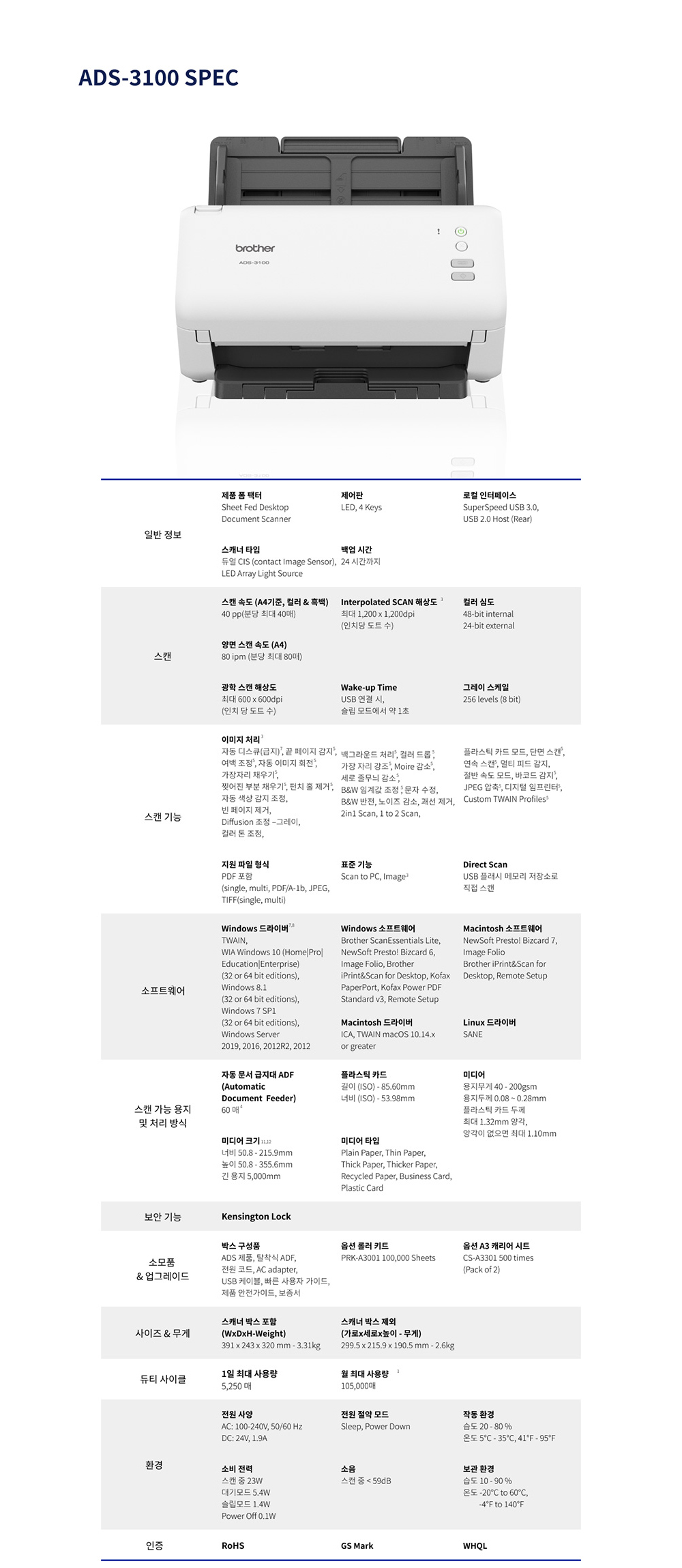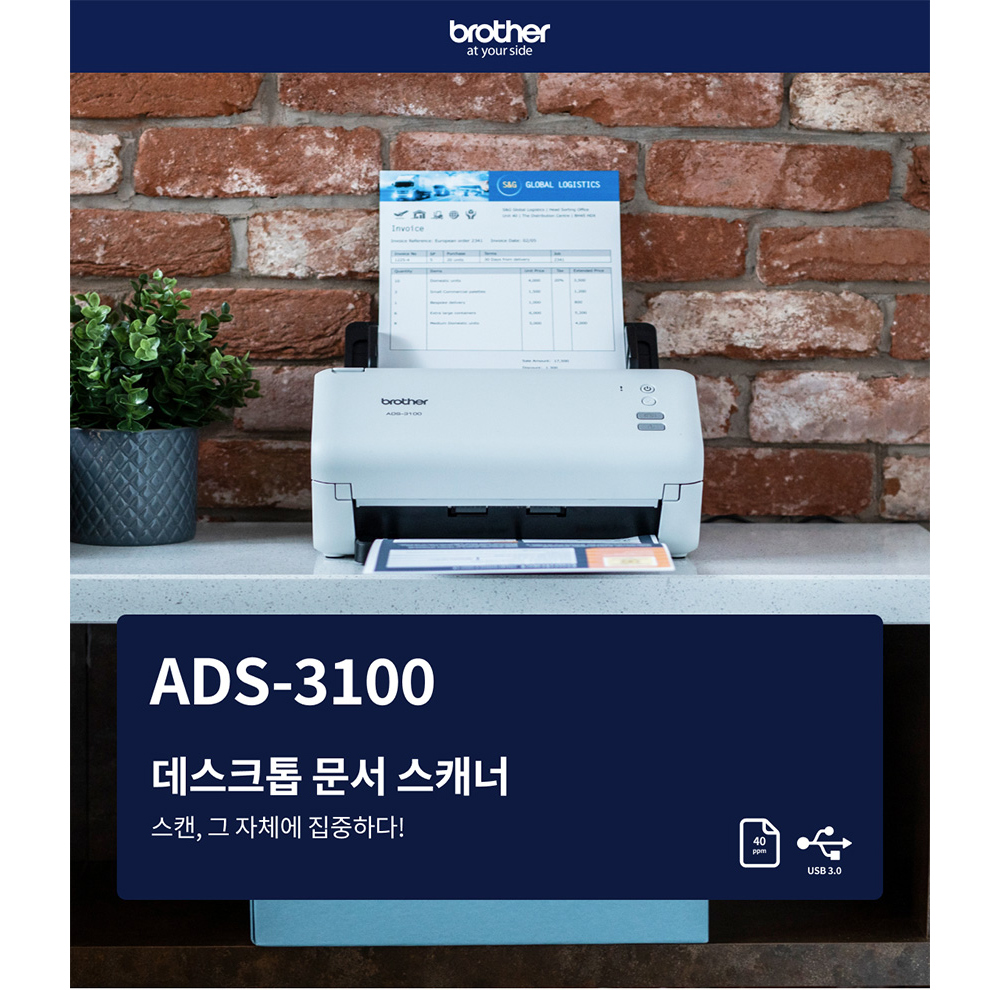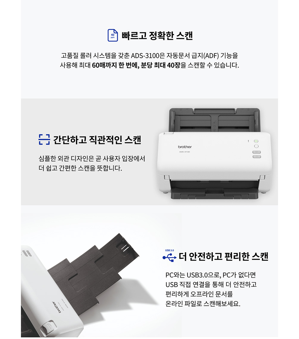 브라더 ADS-3100 (스캐너) 양면스캔, ADF 지원 데스크톱 고속 문서 스캐너