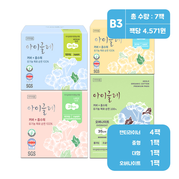 흡수체까지 100% 유기농 인증 목화 순면 생리대 B3 set (파우치 증정)