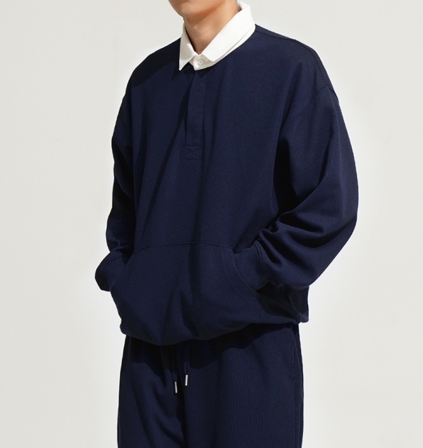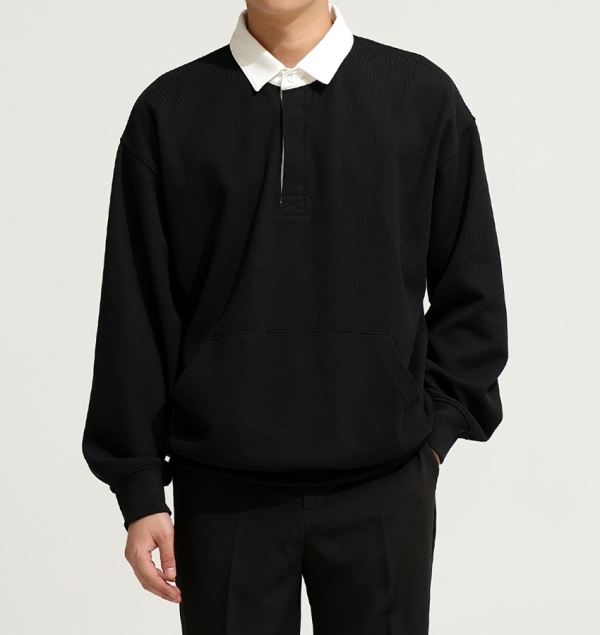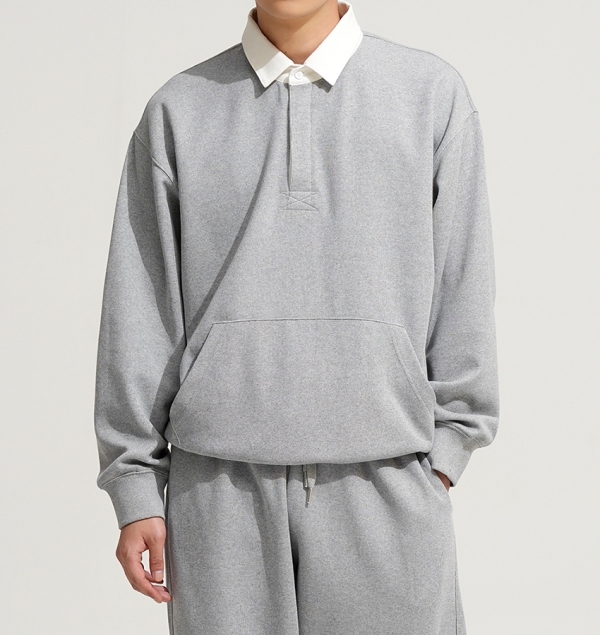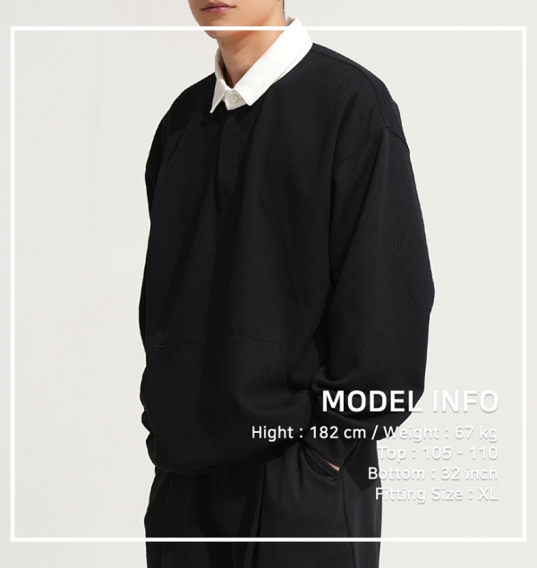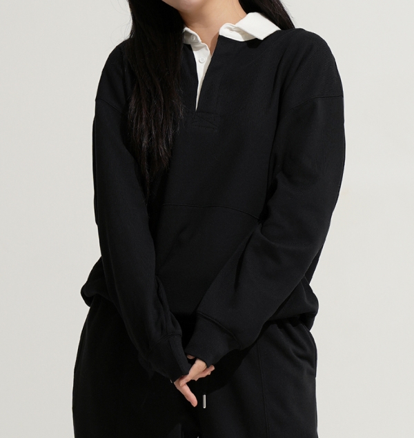90년대 감성을 재해석하여 트렌디하고 베이직한 럭비 맨투맨 상품임 활동성 및 일상 생활/일상복으로도 레이어드 가능하며 같은원단의 스트링 바지와 셋업 구성 가능함