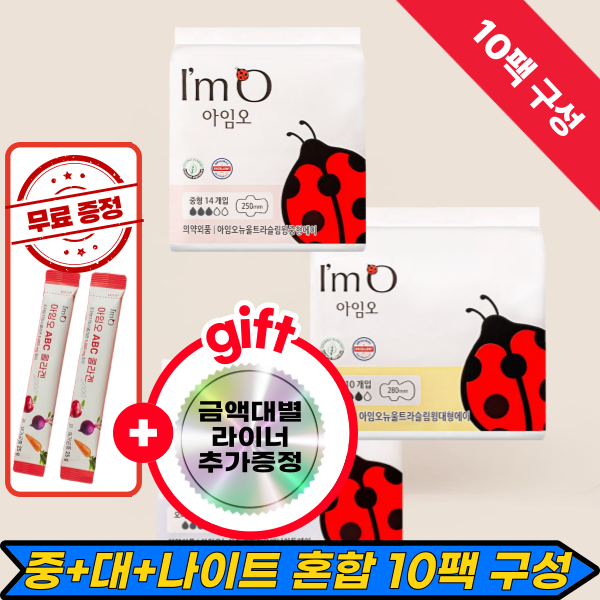 [사은품증정][10팩구성][유기농 생리대 아임오] 초특가+증정품(소,중,대,라이너,롱라이너,나이트)