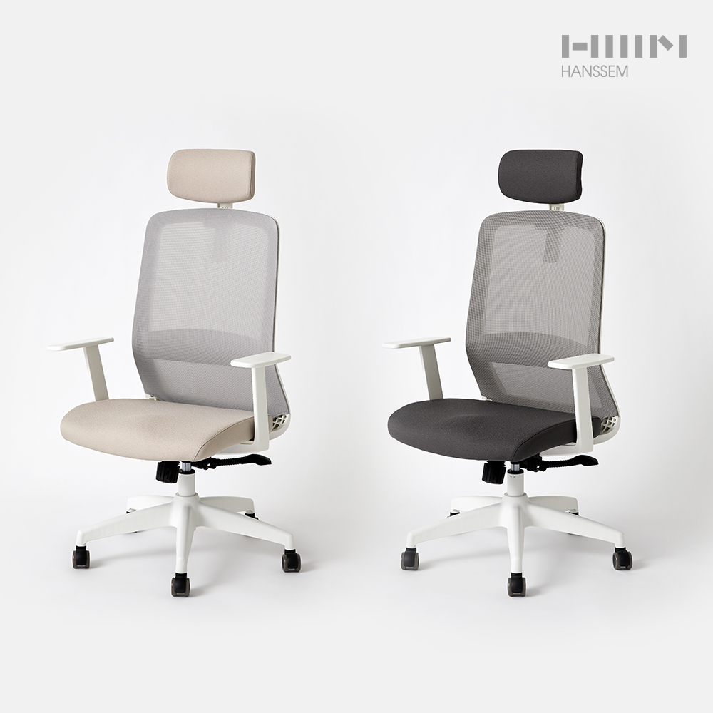 높낮이 조절 목받침, 에어메쉬등받이, 폭 넓은 유선형 팔걸이, 높낮이 조절 레바, 균형잡힌 오발